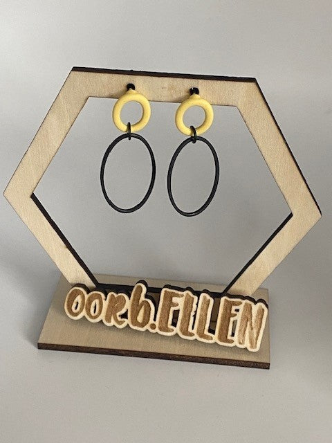 zwarte ellips aan pastelgeel ovalen knopje